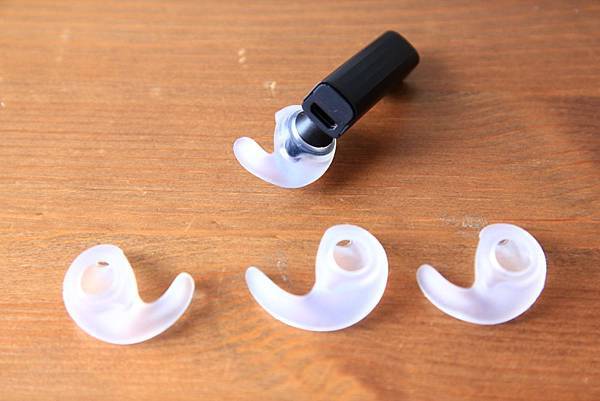 看看各種不同大小的耳塞!基本上Jawbone Era雖然沒有用耳掛來固定,但只有選了適合的Size,戴好耳機也是不會掉的。像小宇蹦蹦跳跳了幾分鐘,Jawbone Era連鬆脫的跡象都沒有呢!