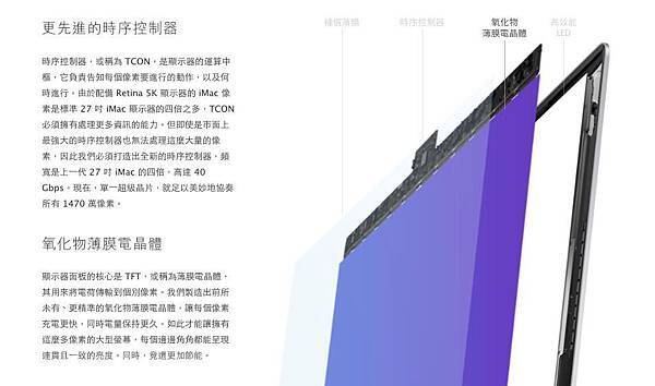 面板採用了「氧化物薄電晶體」技術。小宇不太了解這種技術,不過從文字敘述上來看,應該可以保證亮度的均勻以及節能。此外,iMac Retina版採用了新的時序控制器,畢竟5K螢幕的畫素比原本27吋螢幕的四倍還多,舊版的晶片理所當然不堪使用。