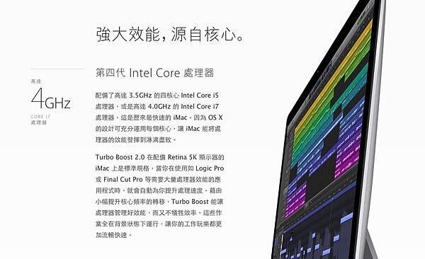 iMac Retina版標準配備了3.5Ghz四核心i5處理器,當然如果你願意多付250美金(約7500台幣),就能升級成4Ghz的i7。看個人需求用不用得到咯!