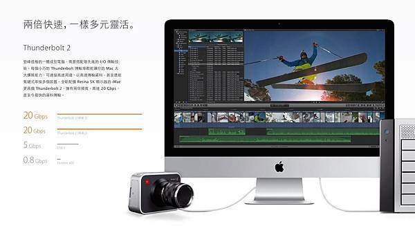 新版iMac配備兩個Thunderbolt接口。Thunderbolt 2的頻寬高達20Gbps,比USB 3.0快速太多不說,甚至比一般的SATA 3硬碟界面的6Gbps都快許多;除了用了外接顯示器外,因為iMac無法自行增加硬碟,Thunderbolt 2也可以用來連接儲存裝置、磁碟陣列等。另外想想看會買入iMac Retina版的人,除了有錢沒處花外,應該都對影像處理方面有額外需求;以Thunderbolt 2的速度優勢,拿來傳輸4K影片、大量的RAW檔,都比起USB 3.0來得有效率許多。