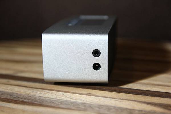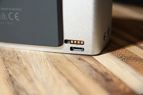 底部的小角落有一組金屬接點,可以用來連接隨附的座充。下方的MicroUSB孔是拿來更新喇叭韌體用的,無法充電也無法輸入聲音。不能用MicroUSB充電真的好可惜,感覺方便度一下子少了好多。