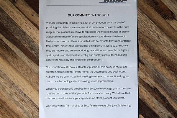 還有一封Bose致消費者的信,主要是說明Bose致力於提供最佳音質、原音重現等。